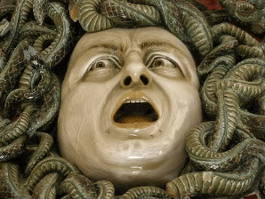 Esto debió pensar Ferruccio Mengaroni, un escultor y ceramista italiano de los años veinte, que con la excusa de una exposición nacional en Monza decidió crear, en 1925, una obra con la cual pasar a la historia; una obra gigantesca con la cabeza de La Medusa como tema. Siendo que no había móviles entonces y teniendo el ego algo crecidito, decidió hacerse un selfie colosal usando su propia cara para personificar el horrendo personaje de la Gorgona y dejar así su rostro en la memoria del mundo.